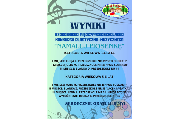 Czytaj więcej!WYNIKI BYDGOSKIEGO MIĘDZYPRZEDSZKOLNEGO KONKURSU PLASTYCZNO-MUZYCZNY „NAMALUJ PIOSENKĘ”