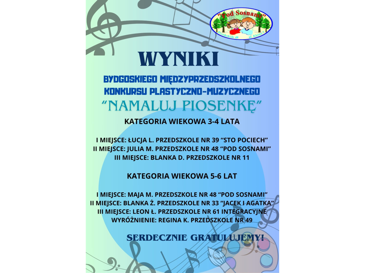 WYNIKI BYDGOSKIEGO MIĘDZYPRZEDSZKOLNEGO KONKURSU PLASTYCZNO-MUZYCZNY „NAMALUJ PIOSENKĘ”